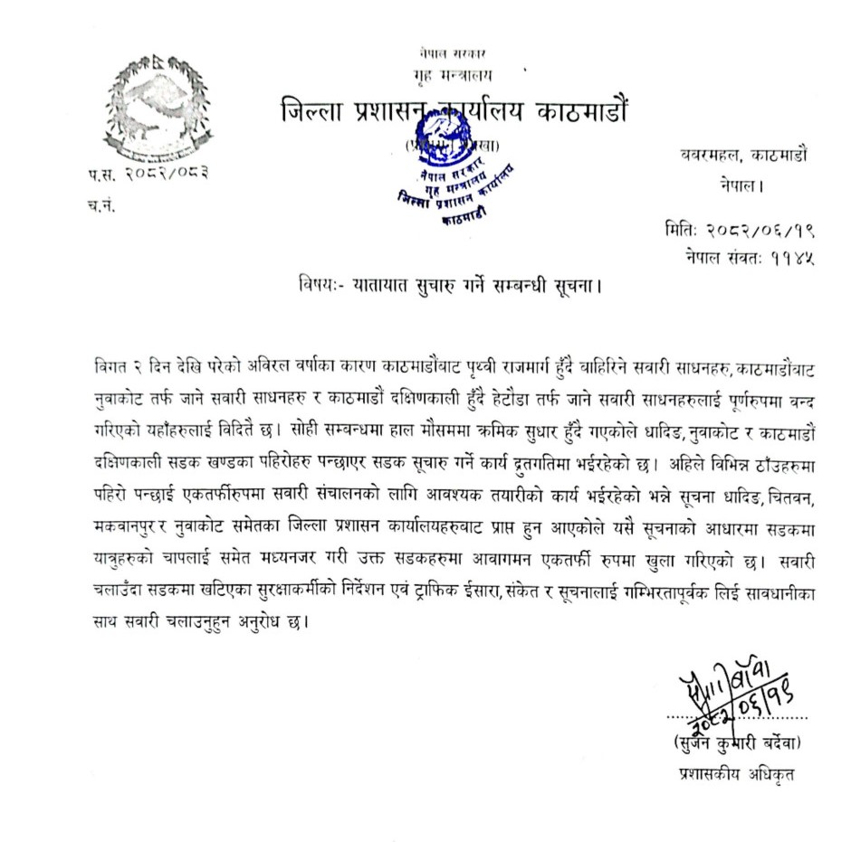 जिल्ला प्रशासन कार्यालय काठमाडौंकी प्रशासकीय अधिकृत सुजनकुमारी बर्देवाले सडकमा यात्रुको चापलाई दृष्टिगत गर्दै उक्त सडकमा आवागमन एकतर्फी रुपमा खुला गर्ने निर्णय गरेको जानकारी दिनुभयो ।
