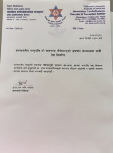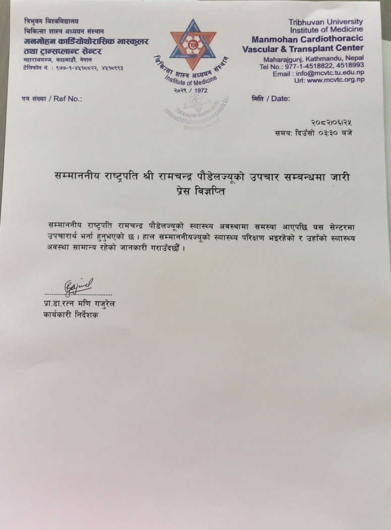 राष्ट्रपति पौडेलको महाराजगन्जस्थित त्रिभुवन विश्वविद्यालय चिकित्साशास्त्र अध्ययन संस्थाको मनमोहन कार्डियोथोरासिक भास्कुलर तथा ट्रान्सप्लान्ट सेन्टरमा उपचार भइराखेको छ।