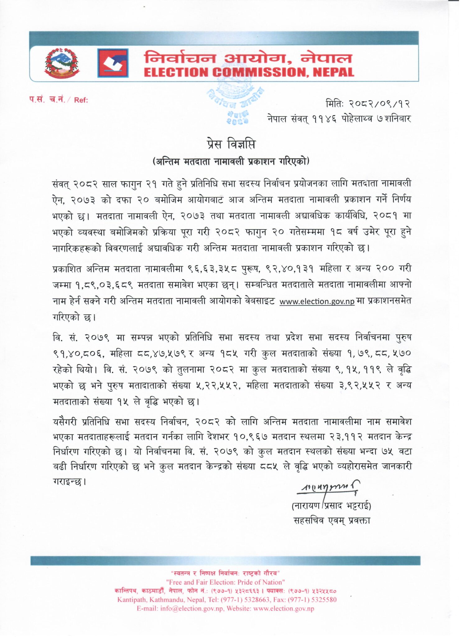 प्रकाशित अन्तिम मतदाता नामावलीमा ९६,६३,३५८ पुरुष, ९२,४०,१३१ महिला र अन्य २०० गरी जम्मा १,८९,०३,६८९ मतदाता समावेश भएका छन्छ । मतदाताले आफ्नो नाम र विवरण आयोगको वेबसाइटमा हेर्न सक्नेछन् ।