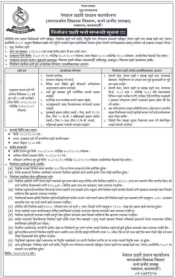 प्रहरी प्रधान कार्यालय, मानवस्रोत विकास विभाग, भर्ना छनोट शाखाले सूचना जारी गर्दै सो सख्यामा प्रहरी माग गरेको छ ।