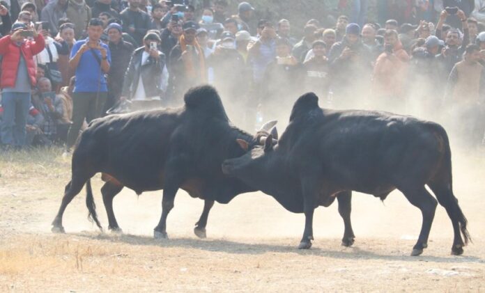 नुवाकोट । मकर सङ्क्रान्ति पर्वका अवसरमा बिहीबार नुवाकोटको तारुका, वेत्रावतीलगायत स्थानमा यसरी गोरु जुधाई प्रदर्शनी गरेर माघे संक्रान्ति मनाइएको छ । करीव २ सय वर्ष अघि देखि त्यस क्षेत्रमा यसरी नै गोरु जुधाएर पर्व मनाईदै आईएको छ । त्यसैलाइ निरन्तरता दिन यो वर्ष पनि विभिन्न स्थानमा विभिन्न इतिहास र किंवदन्तीसँग जोडेर गोरु जुधाई प्रदर्शनीसहित सांस्कृतिक गतिविधिका साथ मकर सङ्क्रान्ति पर्व मनाइएको हो ।