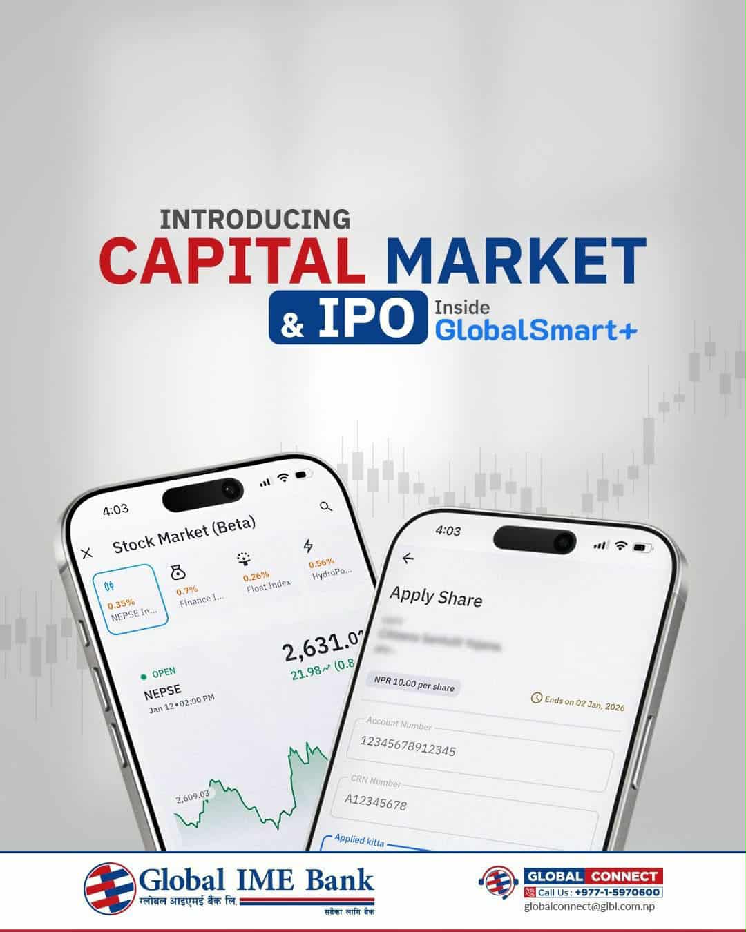 काठमाडौँ । ग्लोबल स्मार्ट प्लस एपमा अब लाइभ मार्केट सुविधा उपलब्ध गराइएको छ, जसले ग्राहकलाई सेकेन्डरी बजारमा भएको सबै कारोबारको रियल टाइम अपडेट प्रदान गर्नेछ।