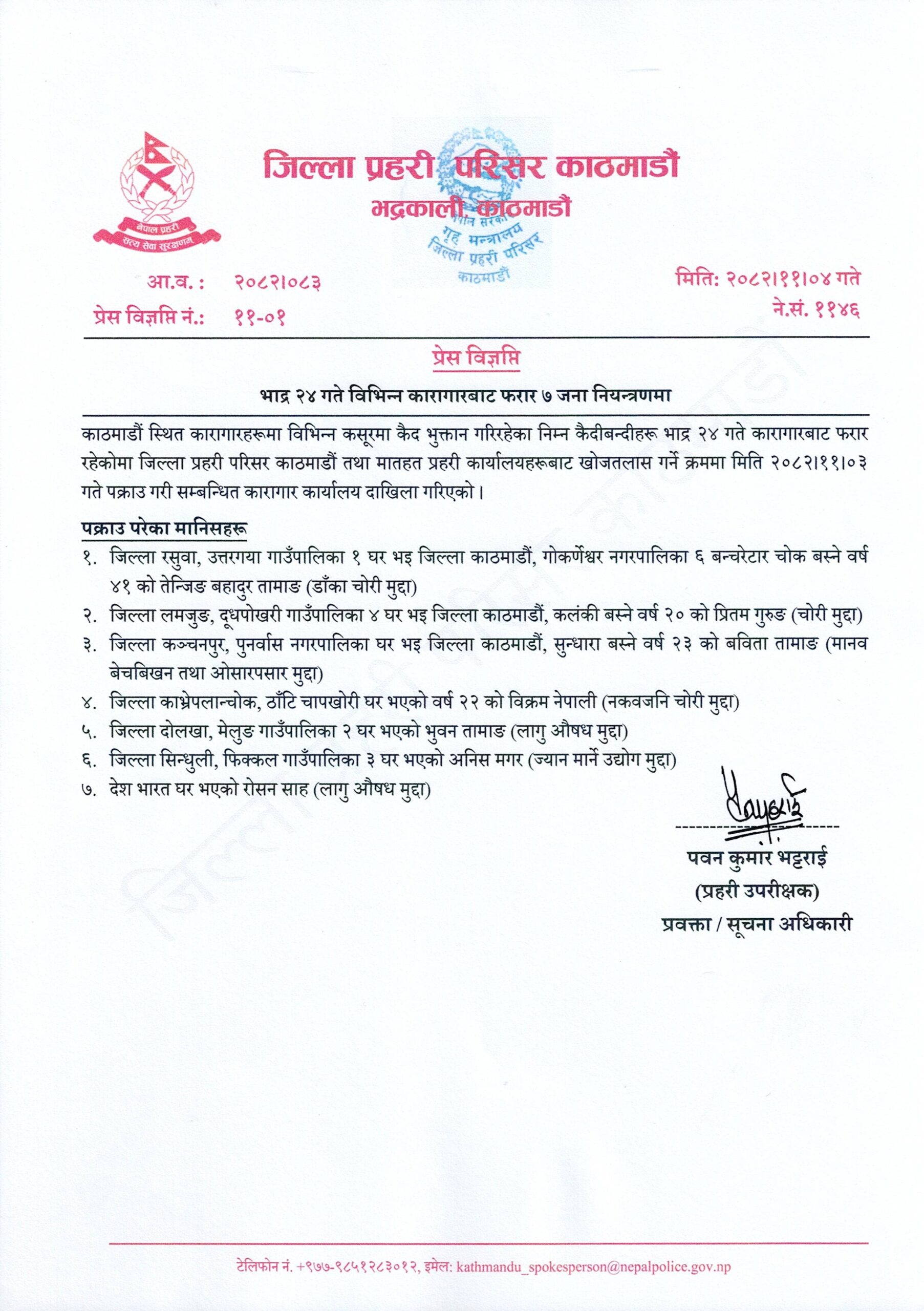 काठमाडौं । जेनजी आन्दोलनको समयमा काठमाडौंका विभिन्न कारागारबाट फरार भएका सात कैदीलाई प्रहरीले पक्राउ गरेको छ । गत भदौ २४ गते जेनजी आन्दोलनका क्रममा फरार भएका उनीहरूलाई जिल्ला प्रहरी परिसर काठमाडौंको टोलीले पक्राउ गरेको हो ।