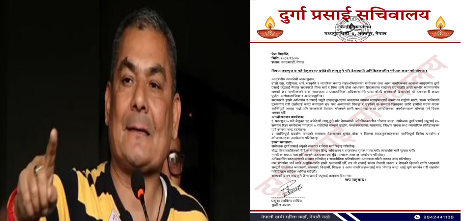 काठमाडौं । ‘राष्ट्र, राष्ट्रियता, धर्म, संस्कृति र नागरिक बचाउ महाअभियान’ले आफ्ना संयोजक दुर्गा प्रसाईंको रिहाइको माग गर्दै फागुन ७ गते राति १२ बजेदेखि लागू हुने गरी देशव्यापी अनिश्चितकालीन नेपाल बन्दको घोषणा गरेको छ।