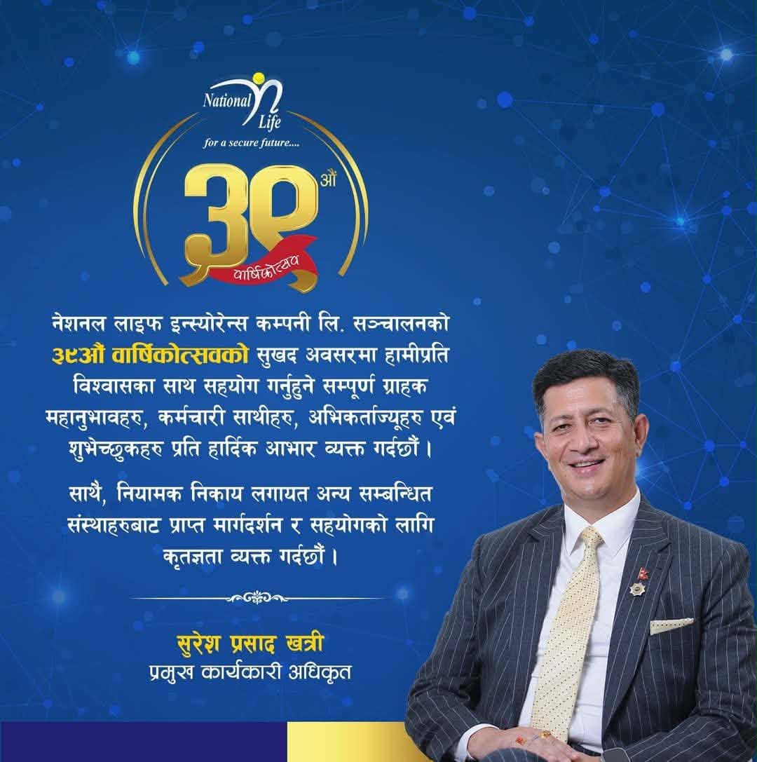 नेशनल लाईफ इन्स्योरेन्स कम्पनि लिमिटेडले आफ्नो ३९ औं वार्षिकोत्सवका मनाएको छ । यस अवसरमा कम्पनिका प्रमुख कार्यकारी अधिकृत सुरेश प्रसाद खत्रीले सम्पूण सरोकारवाला,साझेदार, सहयात्री, साथिभाई, शुभेक्षुक लगायत सम्पूर्णमा हार्दिक शुभकामना व्यक्त गर्नु भएको छ ।