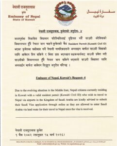 कुवेतस्थित नेपाली दूतावासले एक सूचना जारी गर्दै कुवेती सिभिल आईडी भएका नेपालीले अनलाइनमार्फत साउदी भिसाको लागि आवेदन दिन सक्ने जनाएको छ । भिसा प्राप्त भएपछि सडकमार्गबाट साउदी प्रवेश गरी साउदीको विमानस्थल हुँदै नेपाल जान सकिने दूतावासले जनाएको छ ।