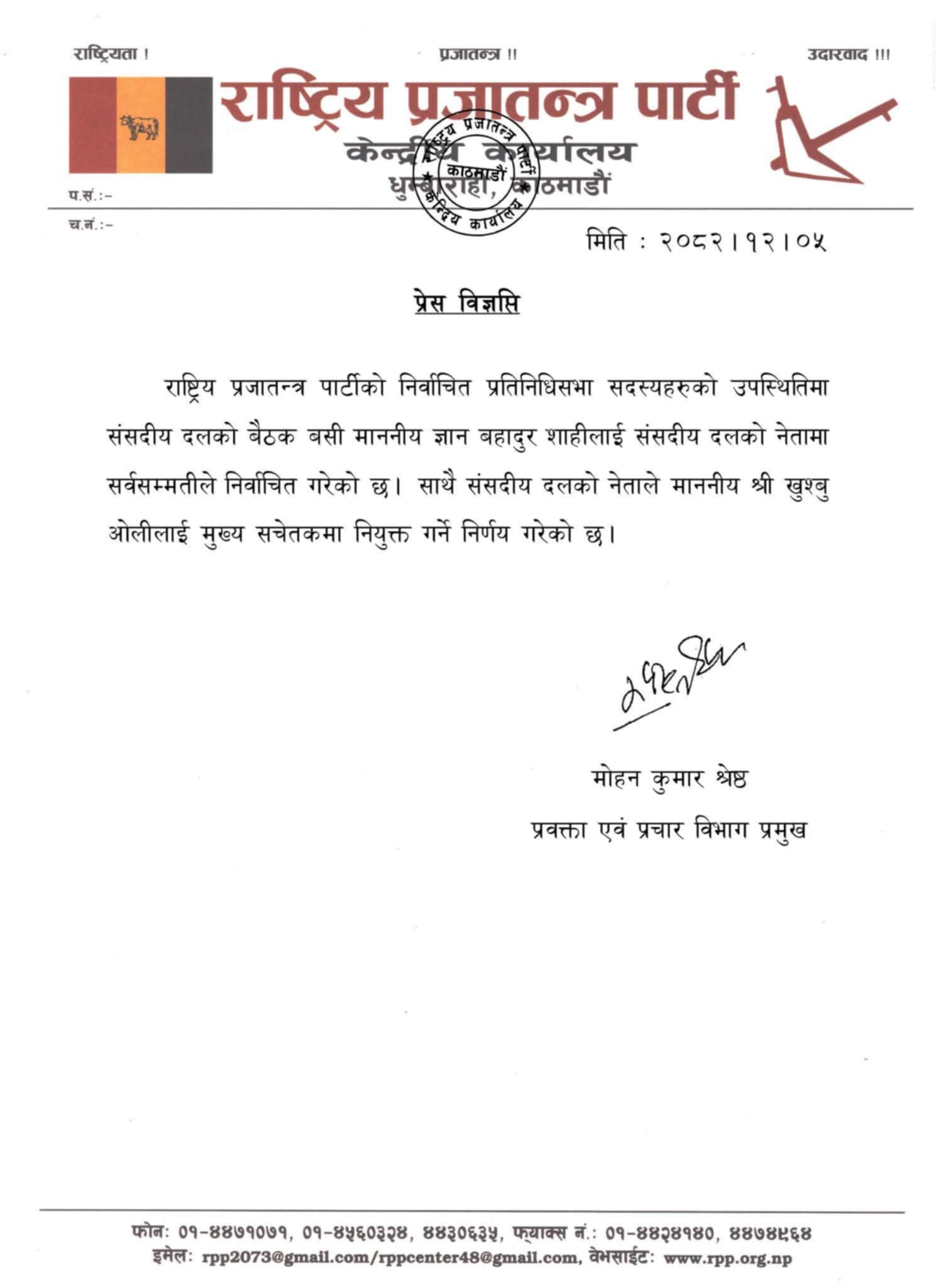 पार्टीको केन्द्रीय कार्यालय धुम्बाराही, काठमाडौंमा बसेको बैठकले प्रतिनिधिसभाका निर्वाचित सदस्यहरूको उपस्थितिमा ज्ञान बहादुर शाही लाई सर्वसम्मत रूपमा संसदीय दलको नेतामा चयन गरेको छ।