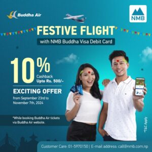 काठमाडौं । एनएमबी बैंकले बुद्ध भिसा डेबिट कार्ड होल्डरहरूका लागि चाडपर्वमा बुद्ध एयरको वेबसाइटबाट फ्लाइट टिकट काट्दा १० प्रतिशत क्यासब्याक अधिकतम ५०० रुपैयाँसम्म नगद दिने घोषणा गरेको छ ।