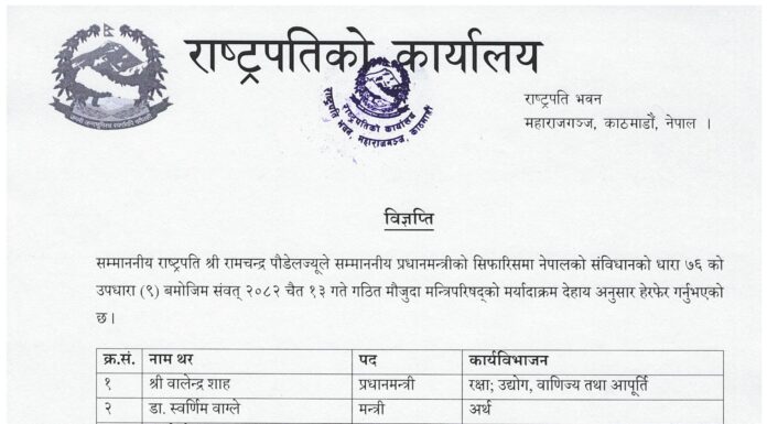 काठमाडौँ । राष्ट्रपति रामचन्द्र पौडेलले मन्त्रीपरिषद्का सदस्यहरूको मर्यादाक्रम हेरफेर गरेका छन् । प्रधानमन्त्री बालेन्द्र शाह ९बालेन०को सिफारिसमा नेपालको संविधानको धारा ७६ को उपधारा ९० मर्यादाक्रम हेरफेर गरिएको हो ।
